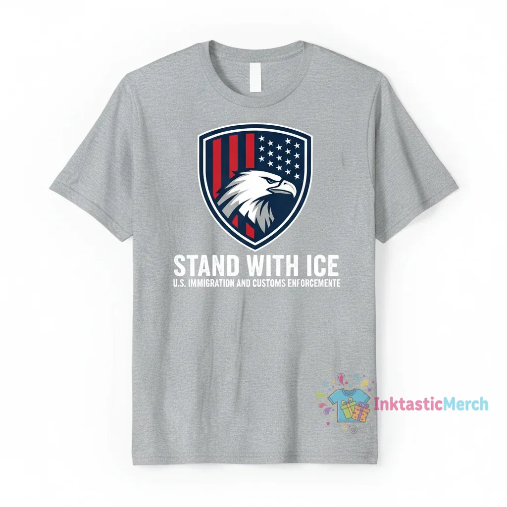 Show your support with the US Immigration and Customs Enforcement ICE Stand With ICE T-Shirt from inktasticmerch.com. This tee is crafted with durable, high-quality fabric for lasting wear and all-day comfort, featuring an eye-catching design with a unisex fit for a versatile, flattering look. It’s the perfect way to express your solidarity and respect for the dedicated individuals who serve within ICE.