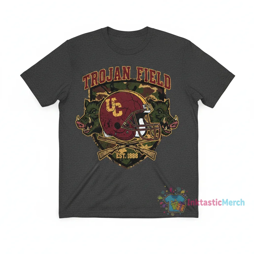 Show your USC spirit with this officially licensed Hunting Camo Football T-Shirt from InktasticMerch. Crafted from 100% ring-spun cotton for superior comfort and breathability, this durable tee features a unique camouflage design and a retail fit, making it perfect for game days or everyday wear.