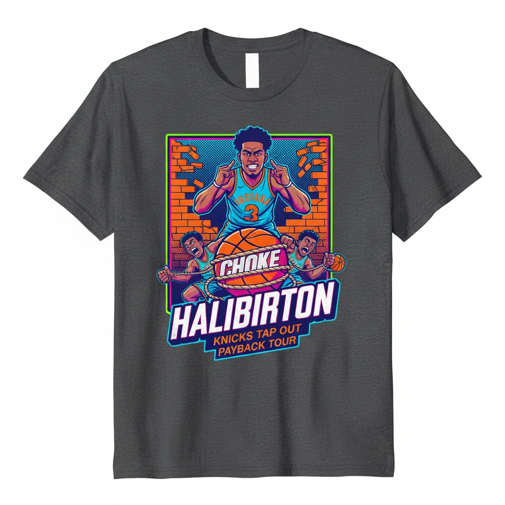 Capture an electrifying moment in basketball with this Tyrese Haliburton ‘Knicks Choke’ artistic tee, crafted from premium cotton for incredible buttery softness. Designed with original artwork that embodies unshakeable confidence, this shirt offers a relaxed, comfortable fit perfect for any fan, showcasing the quality and passion from InktasticMerch.