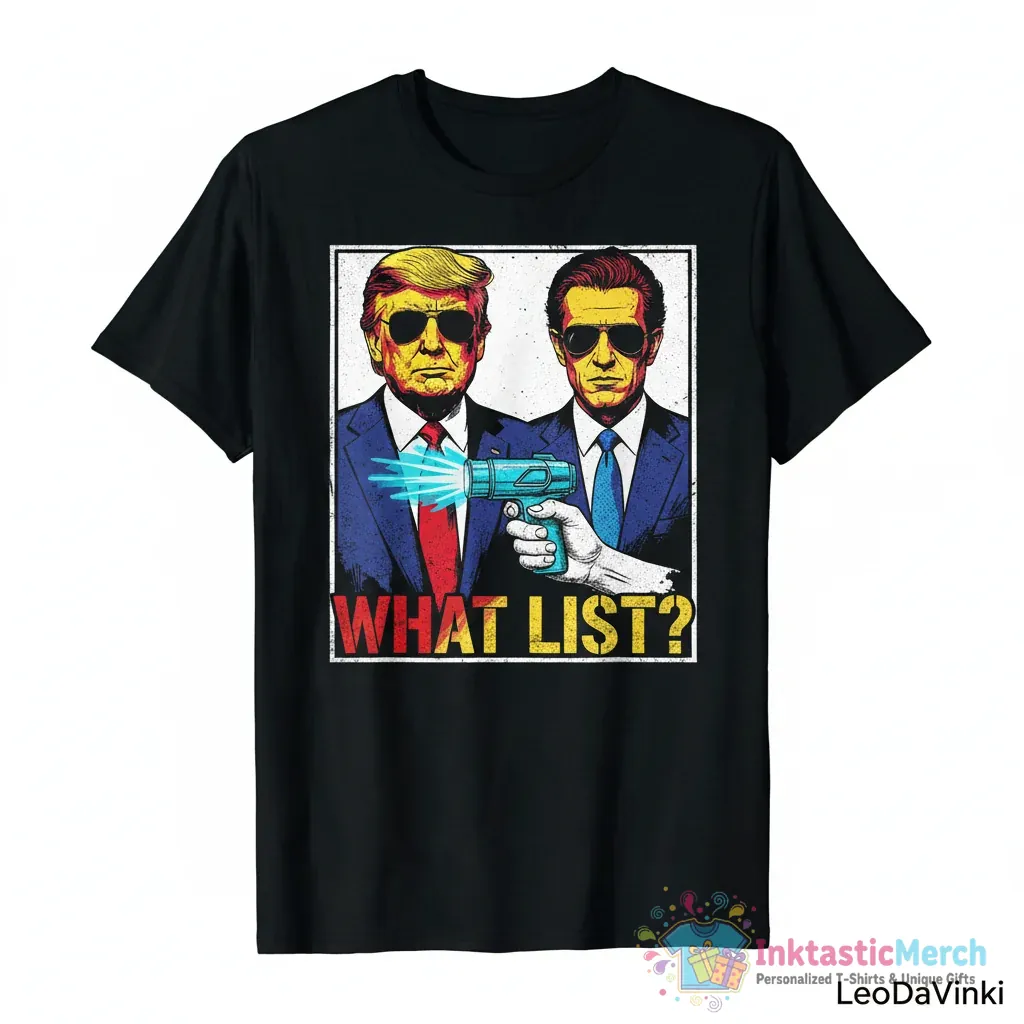 Show off your unique perspective with the “What List? Donald Trump with Jeffrey Epstein” T-shirt. Made from incredibly soft, high-quality fabric, this tee offers a comfortable fit for everyday wear, making it a standout addition to any wardrobe from InktasticMerch. This shirt is designed for those who appreciate edgy humor and want to express their views through their clothing choices, featuring a bold and thought-provoking design that’s sure to spark conversation.