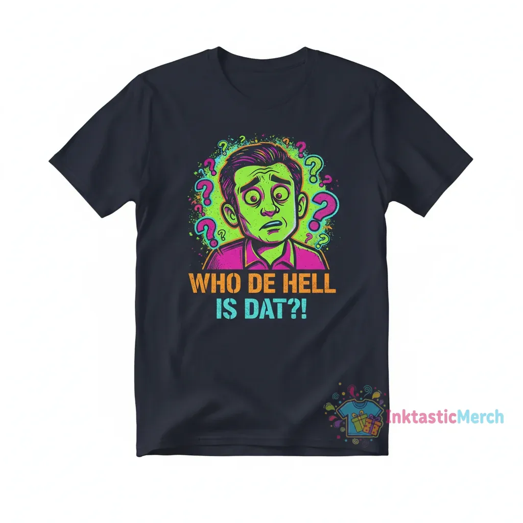 - Unique and humorous “Who de hell is dat?!” graphic print.