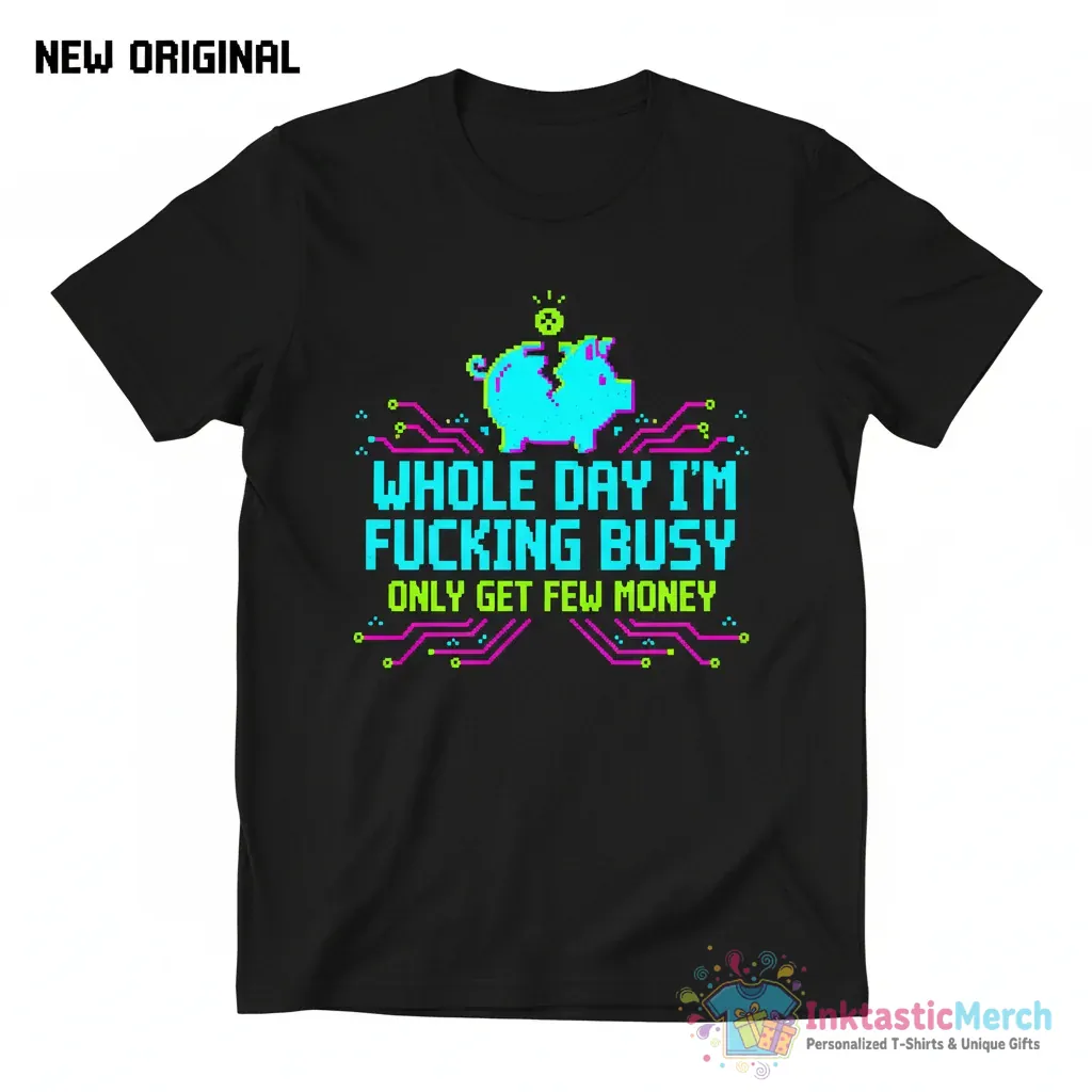 - Unique “Whole Day I’m Fucking Busy Only Get Few Money” graphic design.
