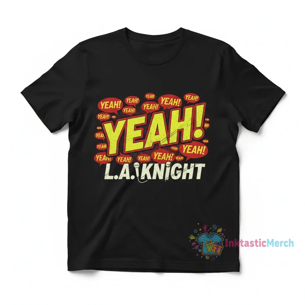 Show your love for the one and only LA Knight with this awesome WWE LA Knight ‘Yeah!’ Repeat T-Shirt. Perfect for any wrestling fan, this tee features a bold design that’s sure to get noticed. It’s more than just a shirt; it’s a statement piece for anyone who follows the WWE action and LA Knight’s undeniable charisma. Get ready to feel like a champion when you wear it!