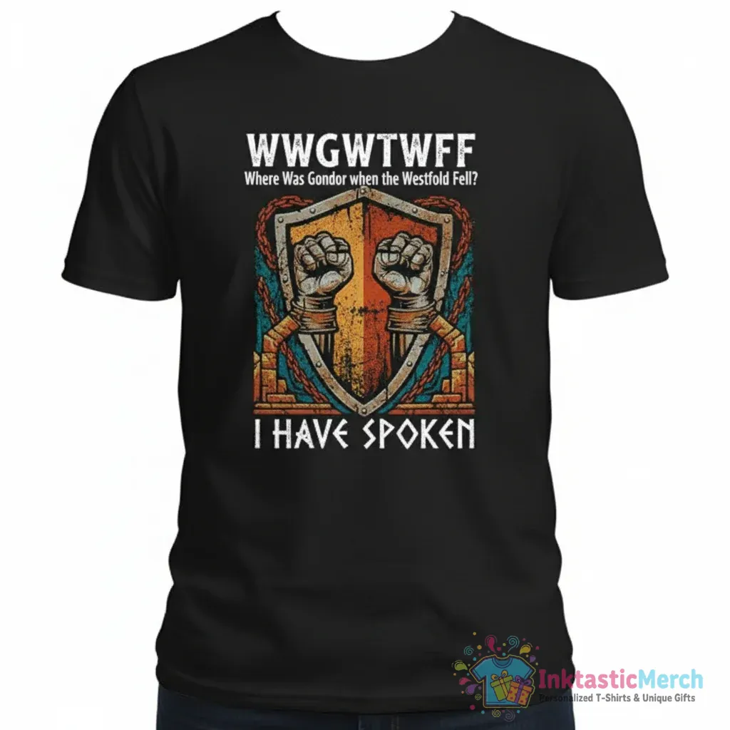 Show your love for epic fantasy with the WWGWTWFF Where Was Gondor when the Westfold Fell? I Have Spoken T-Shirt from InktasticMerch. This tee is made for everyday wear, combining comfort and style with its ultra-soft, breathable fabric and high-quality print that lasts wash after wash. It features a unique design that sparks conversation and displays your passion for Middle-earth, making it a must-have addition to your wardrobe.