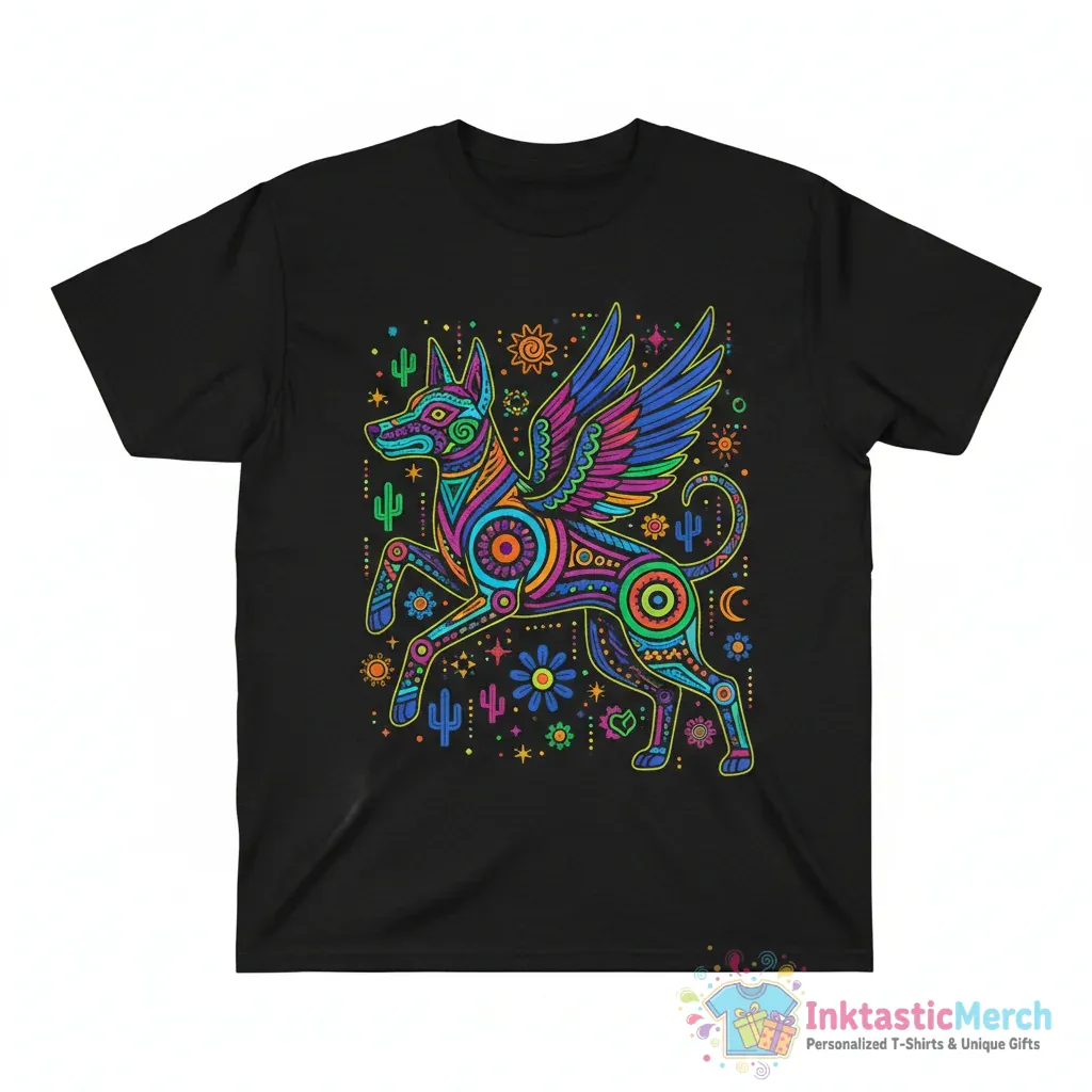 Showcase your unique style with the Xoloitzcuintli Alebrije T-Shirt from our Mexican Art Collection. This tee features stunning AI-generated artwork inspired by traditional Mexican folk art, bringing a mythical Xoloitzcuintli dog to life in a colorful Alebrije style, a wearable piece of art that celebrates rich cultural heritage and modern creativity. Crafted for everyday wear, it offers exceptional softness and a relaxed feel that makes it your new favorite go-to shirt, visit inktasticmerch.com to explore more.