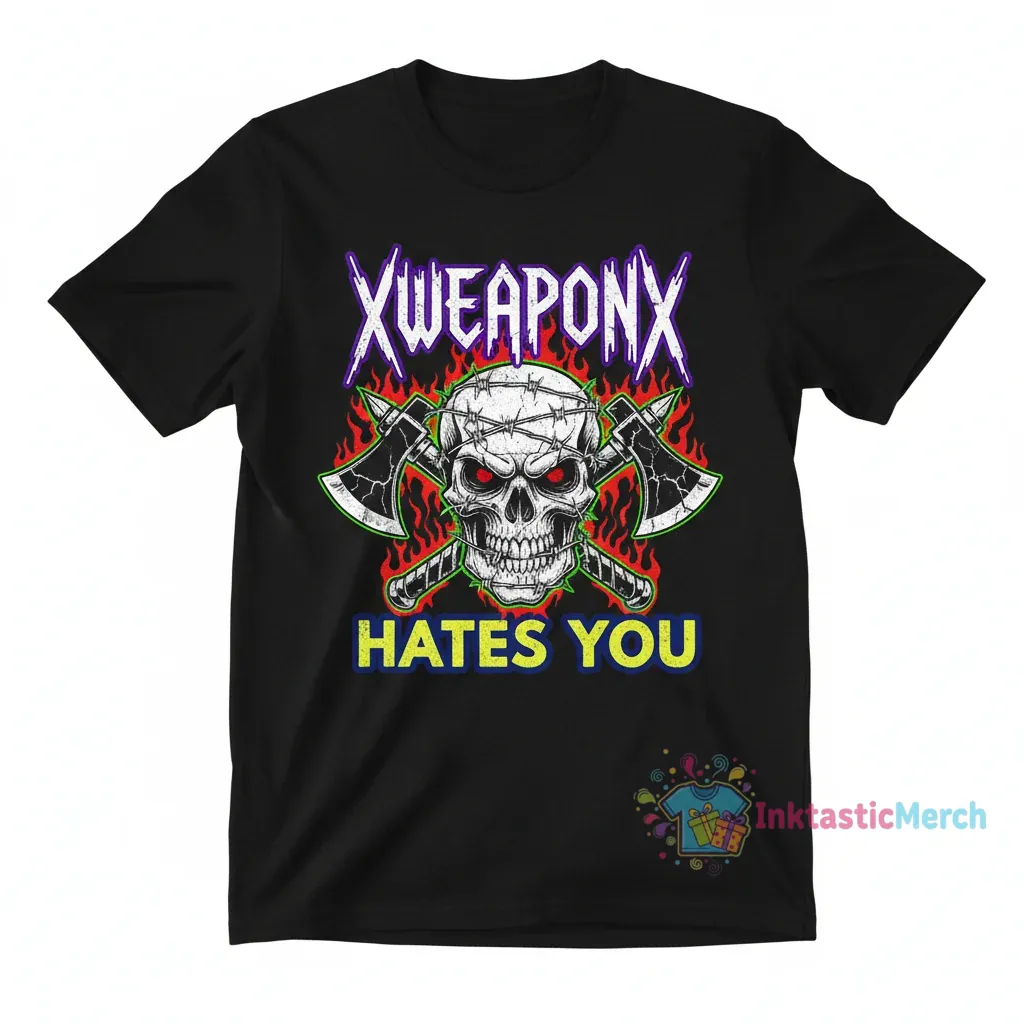 Make a bold statement with the XweaponX Hates You Shirt from InktasticMerch. This tee is crafted for supreme comfort and premium quality, featuring a striking design perfect for those who love unique and bold fashion statements. It’s the ideal way to add an edgy touch to your wardrobe and express your distinctive personality.