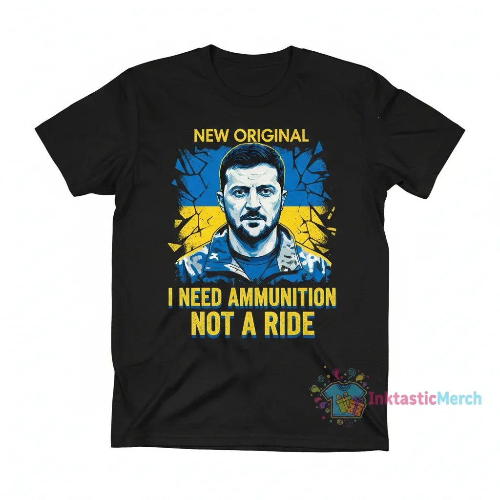 Show your support and solidarity with the iconic “I Need Ammunition, Not a Ride” Zelensky Quotes T-Shirt. This premium quality tee features a powerful statement attributed to Ukrainian President Volodymyr Zelensky, reflecting resilience and determination during challenging times. Perfect for patriots, history enthusiasts, and anyone who believes in standing strong, this shirt is more than just apparel – it’s a statement of unwavering support. Designed for comfort and impact, it makes a thoughtful gift or a personal wearable declaration of principle.
